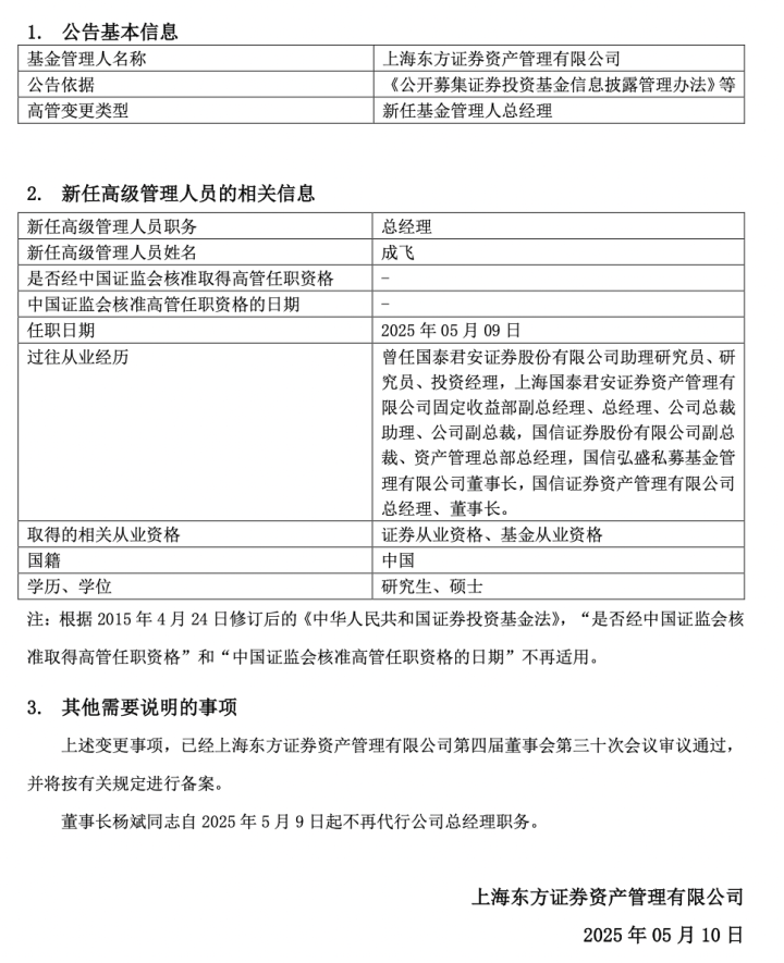 5月9日,上海东方证券资产管理有限公司(下称“东方红资管”)公告称,原国信证券副总裁、国信资管董事长成飞自5月9日起正式担任东方红资管总经理,董事长杨斌不再代行总经理职责。