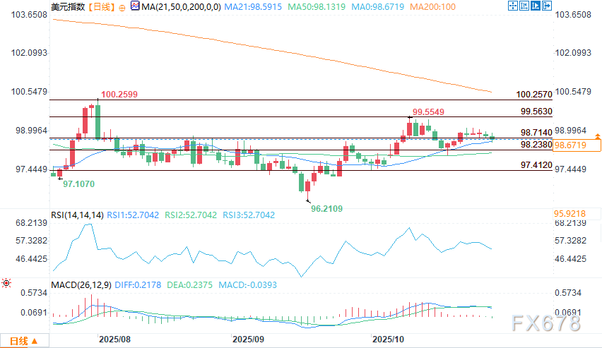 汇通财经APP讯——周二(10月28日),美元指数在周二盘中承压炒股票配资平台,延续了自10月22日高点99.139以来的四日回调,跌至98.668。价格已突破98.797的小枢纽点和98.650的61.8%回撤位,今日低点触及98.565。交易员们正在关注98.132的50日移动平均线,它可能成为逢低买入者的支撑位,也可能在失守后引发向97.462的更深幅下跌。
