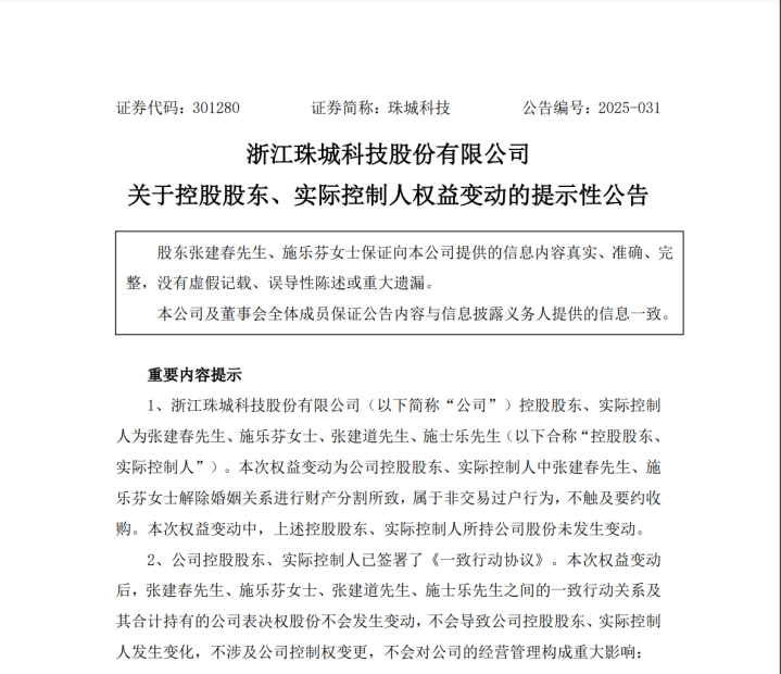 珠城科技公告称,公司于近日收到控股股东、实控人中张建春和施乐芬的通知,经双方协商一致,已解除婚姻关系,并就离婚财产分割事宜作出相关安排。